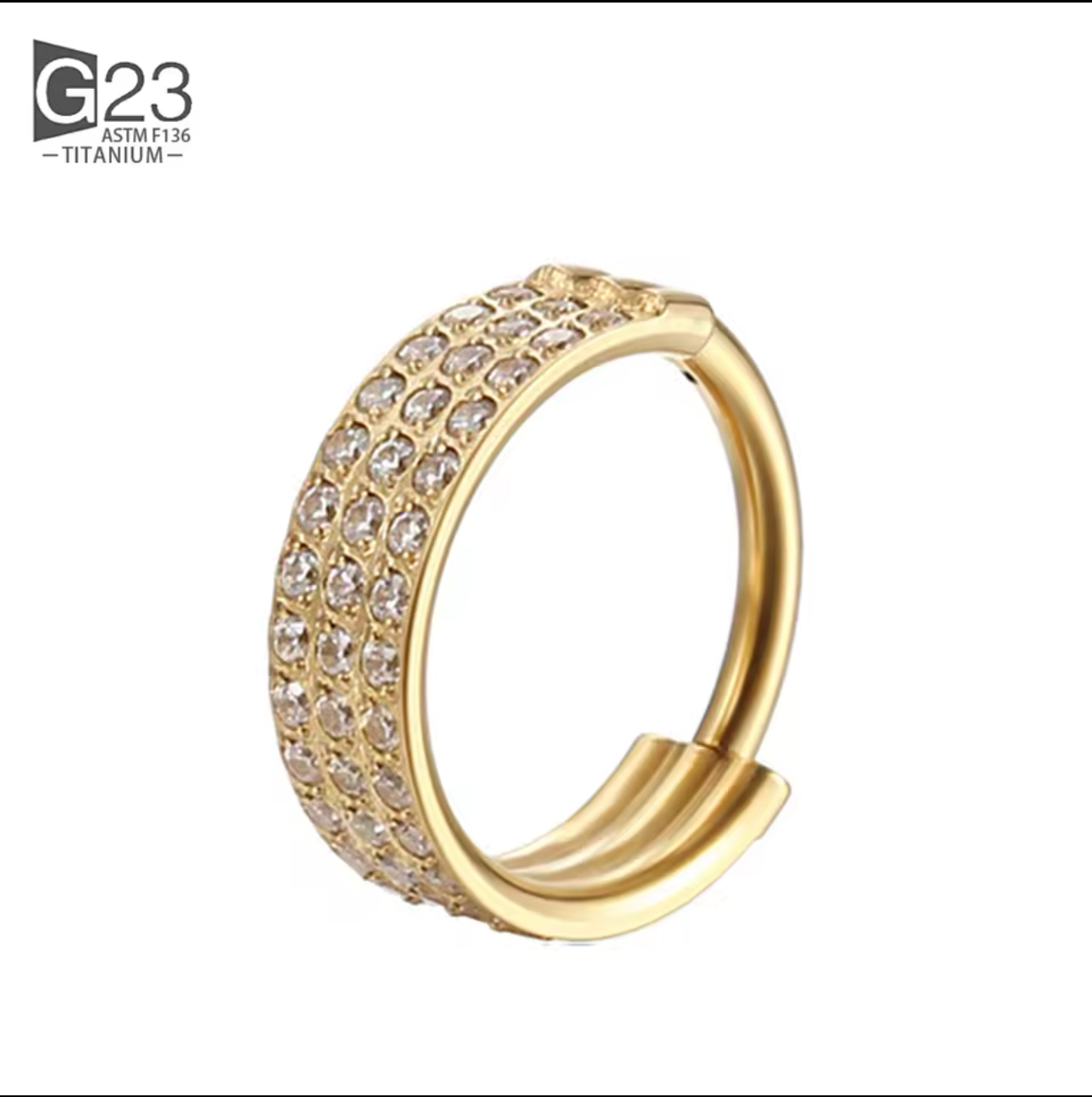 Argola confeccionada em titânio F-136 (grau implante), com zircônias cravadas e sistema de fechamento clicker.